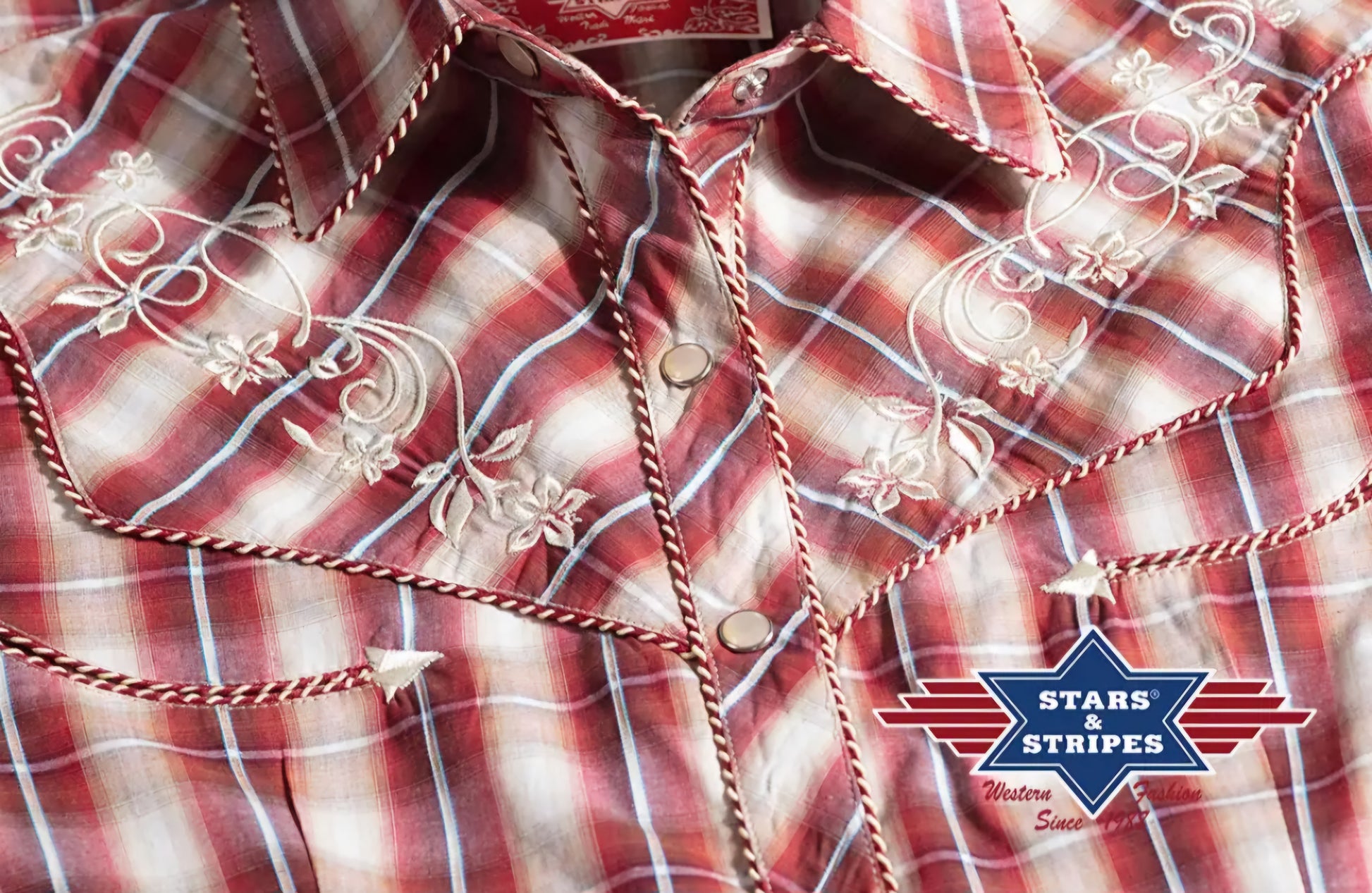 Mooie geruite western blouse met borduurtekening op de borst en rug.